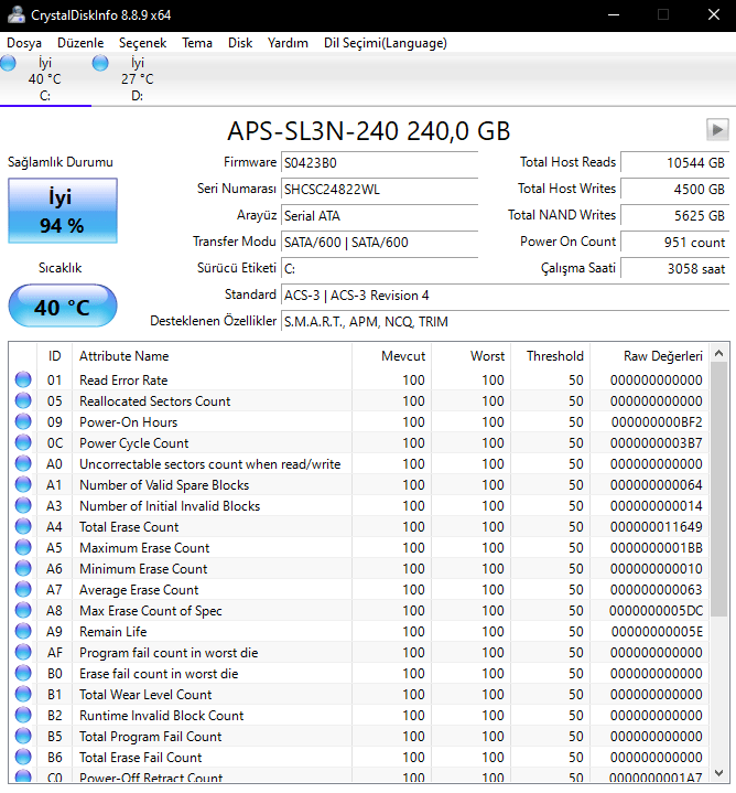 Crystal Disk Info: Yapı olarak HDD Sentinel'e benziyor. Eğer aşağıdaki noktalarda mavi dışında bir renk varsa örneğin sarı veya kırmızı, yeni aldıysanız iade edin, yeni almadıysanız bilgilerinizi yedekleyin. Sorunlar olabilir.