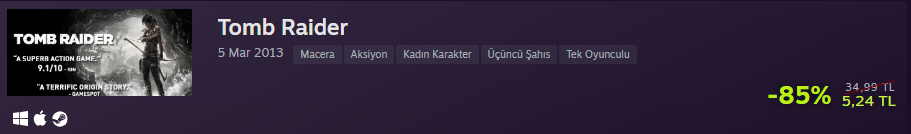 Tomb Raider: Belki de severek oynadığım tek Tomb Raider oyunu budur. Dolu dolu Aksiyon bulunduran ve zamanına göre baya hoş grafiklere sahip olan bir oyun.