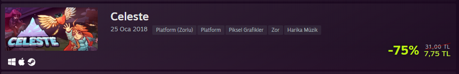 Celeste: Çok sevimli bir hikayeye, ama bir o kadar da zor bir oynanışa sahip bir oyun Celeste. Müziklerine de bayılırım. Platform oyunlarını seviyor iseniz denemenizden zarar gelmez. Zira platform oyunu sevip, bu oyunu sevmez iseniz çok şaşırırım.
