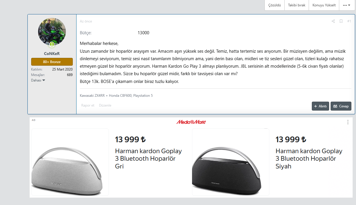 Uzun zamandır bir hoparlör arayışım var. Amacım aşırı yüksek ses değil. Temiz, hatta tertemiz ses arıyorum. Bir müzisyen değilim, ama müzik dinlemeyi seviyorum, temiz sesi nasıl tanımlarım bilmiyorum ama, yani derin bası olan, midleri ve tiz sesleri güzel olan, tizleri kulağı rahatsız etmeyen güzel bir hoparlör arıyorum. Harman Kardon Go Play 3 almayı planlıyorum. JBL serisinin alt modellerinde (5-6k civarı fiyatı olanlar) istediğimi bulamadım. Sizce bu hoparlör güzel midir, farklı bir tavsiyesi olan var mı?