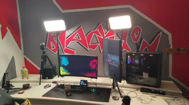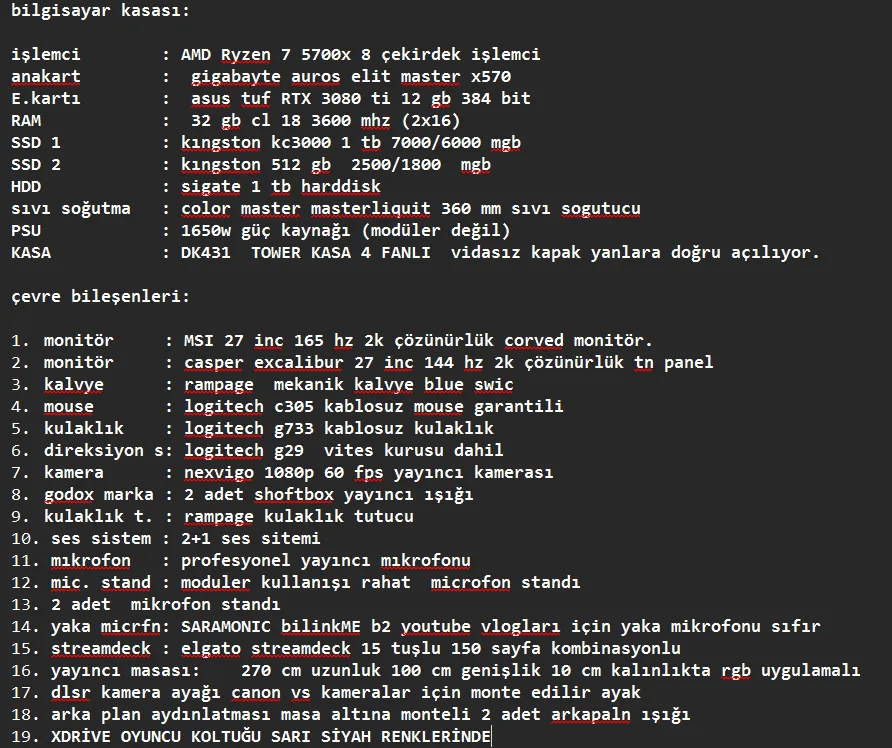BU ARADA BİLGİSAYAR MASASI YANI YAYINCI MASASI ÖZEL YAPIMDIR HER TURLU KULLANIMA UYUM SAĞLAYAN RGB ÖZELLİKLİ KABLO GIZLEME ALANLARI VARDIR AĞIRLIĞI 160 KG 2.70 CM UZUNLUK 1 M GENİŞLİK.