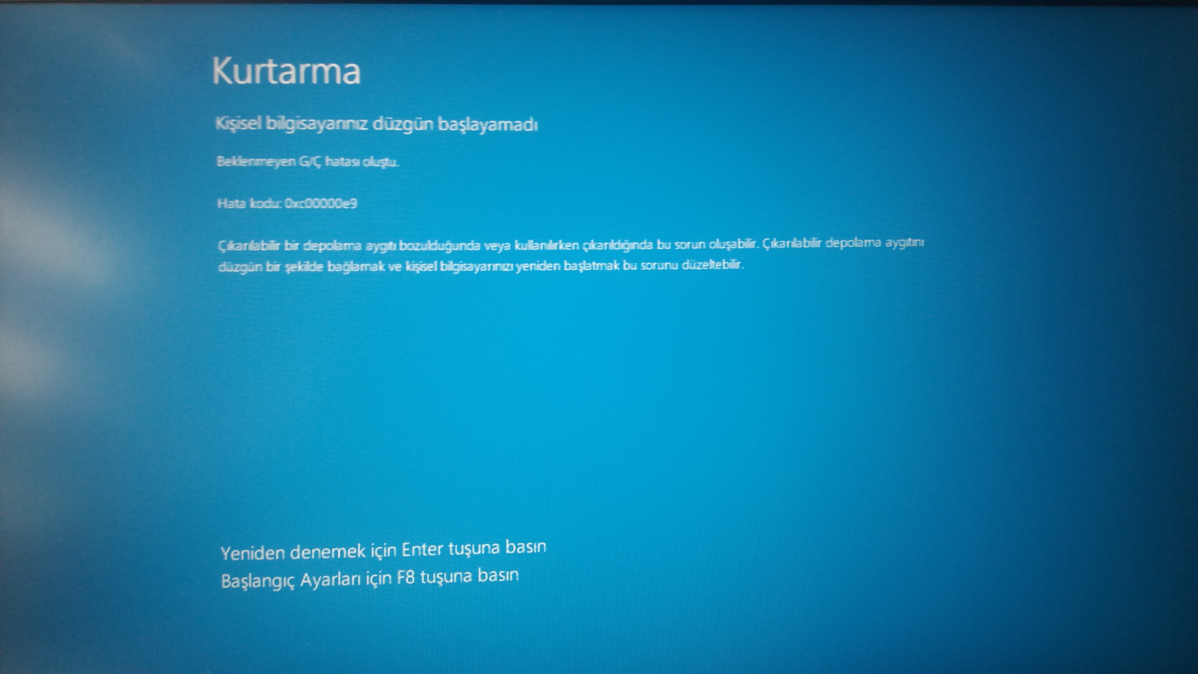 VisualStudio kodlama yaparken bazen mavi ekran alıyordum ama bilgisayar tekrardan açılıyordu bugün de oyun kurarken bir defa mavi ekran verdi sonra kapandı garip garip bir menü verdi o menü siyah bir menü. Exit dedim daha önce de aynı menü gelmişti. Bir defa başlattım ve bu sefer açılmadı bir kaç defa açıp kapattım ama ekran ya çok uzun sire siyah kalıyordu veya yeniden başladığım zaman beyaz çizgili turuncu bir ekran geliyordu. Hızlı bir şekilde çözümü yazarsanız sevinirim. Kendi bilgisayarımda değil annemin iş bilgisayarı teşekkürler.
