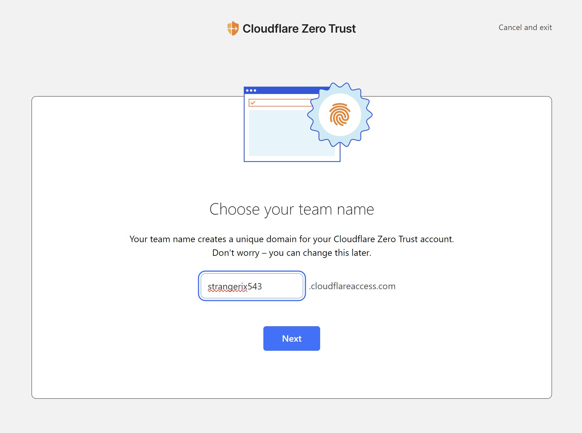 Tıkladıktan sonra *burası önemli* buraya herhangi bir takım adı yazın. İstediğiniz şey olabilir ama kolay bir şey yazmayın. Başkasınınki ile uyuşmasın. Sonra Next'e tıklayın. Burada yazdığınızı .cloudflareaccess.com halinde unutmamak için bir yere kaydediniz. Sonraki adımlar fotoğraflı.