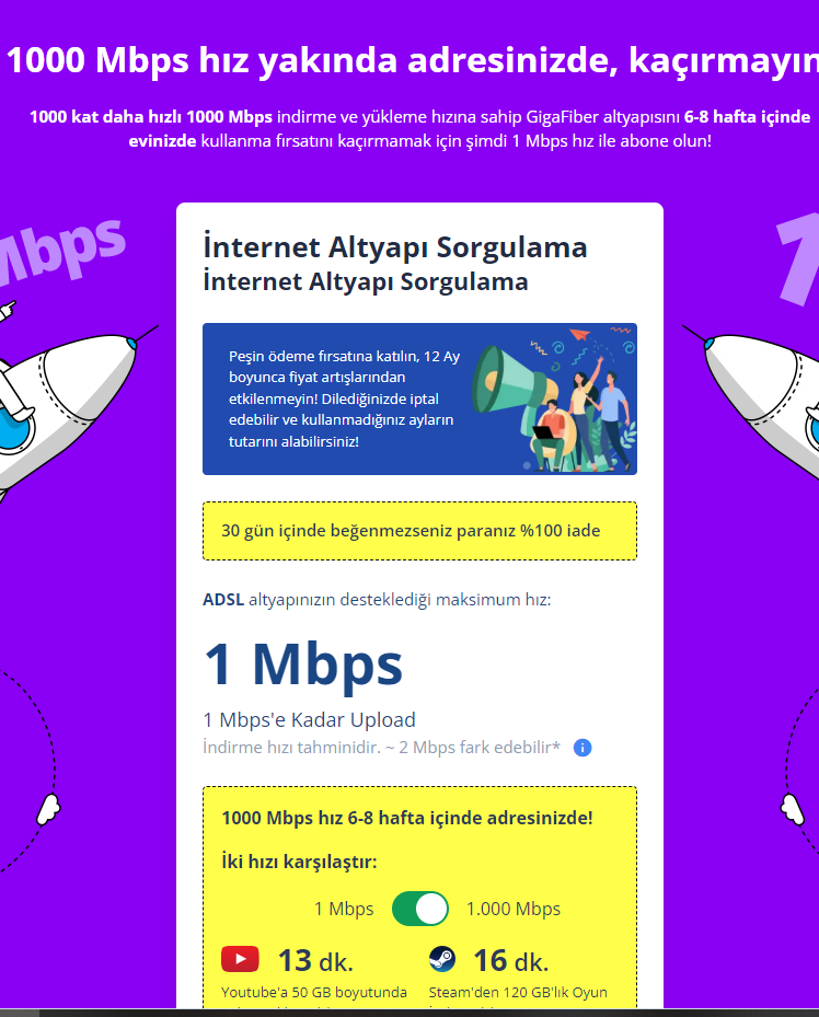 1000MBPS hız 6-8 hafta içinde adresinizde diyor. Bir arayıp sorun derim.Alıntıyı görüntüle 2 aydır kutu var ama gigafiber gelmedi, acaba gigafiber şimdi aktifleşmidir diye baktım çıkan ekran bu şuan bide 100 mbps kullanıyorum ben ne eyleyeyim siz söyleyin