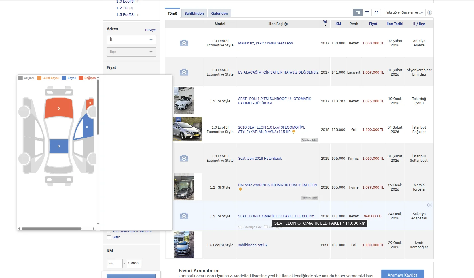 Hocam aşağıdaki filtrelerde şu araçlar çıkıyor çoğunun en önemli parçalarında işlem var ( kaput - tavan - bagaj )Leon da var