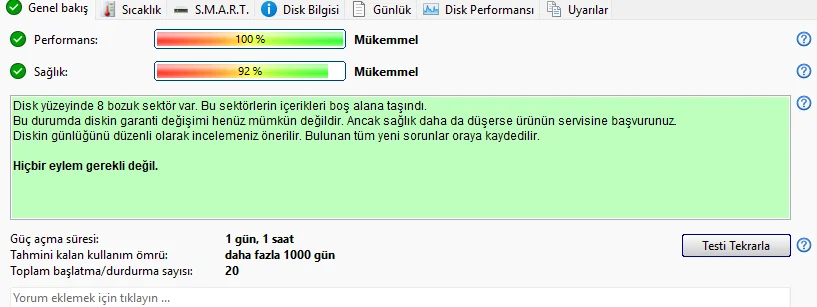 8 Bad Sector var ama kesinlikle ondan olduğunu düşünmüyorum. Zamanında 100 küsür bozuk sektör ile 5 sene kullanmışlığım var 500gb seagate diski.