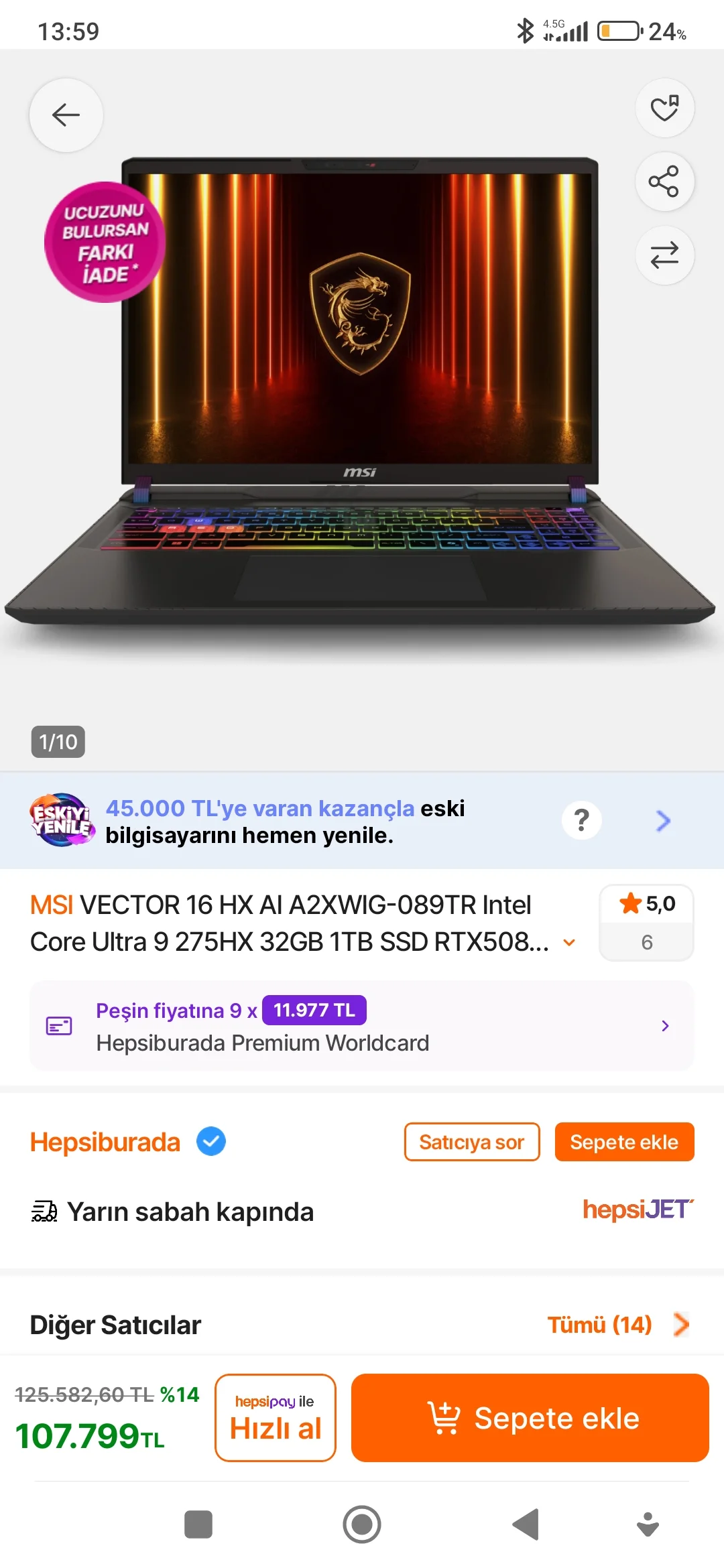 🔥 107799₺ (✅ Satıcı Hepsiburada'nın kendisi ve indirimli fiyat. Borderlands 4 ve Battlefield 6 hediyeli olabilir, alırsanız kontrol edin.) MSI VECTOR 16 HX AI A2XWIG-089TR Intel Core Ultra 9 275HX, RTX 5080 (16GB, 175W + Mux) 32GB/1TB (2x16GB 6400MHz DDR5 RAM, bir M.2 yuvası boşta) 16” QHD+ 500nit %100DCI-P3 240Hz IPS 90Wh 2,7kg, 330W adaptör, W11 Home : https://app.hb.biz/BaesLmF2F4pv