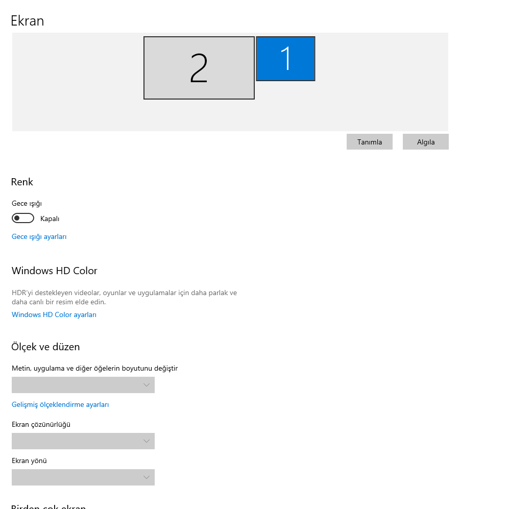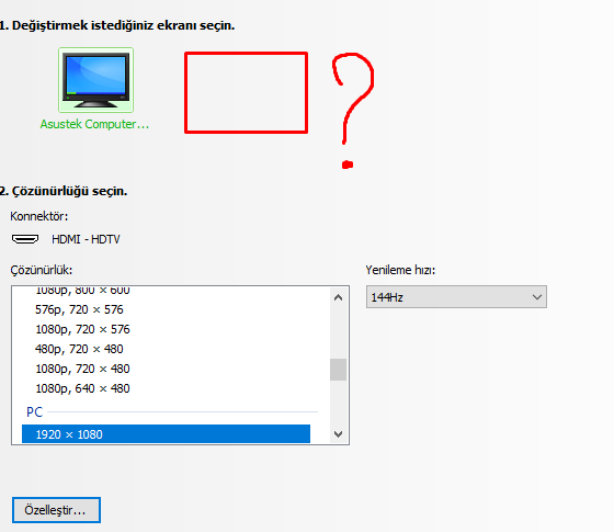 Dostlar önceden 2. monitörü algılıyordu aşağıdakli resimde kırmızı kutunun olduğu yerde diğer monitör oluyordu fakat şuan algılamıyor, takınca ses geliyor pcye usb falan takınca gelen ses ama monitörü görmüyor, bazen görüyor ve diğer fotodaki gibi ayar yaptırtmıyor gri kapalı kutu oluyor. VGA kablosu sipariş ettim taktım görüntü gel git yaptı sonra cable not connected dedi. Eski kabloyu takıyorum fakat gene algılamıyor aşağıdaki gibi.