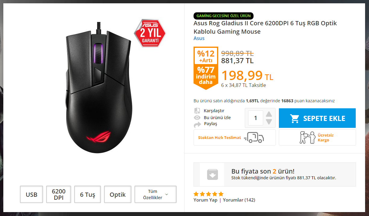ASUS ROG Gladius II Core 6200DPI 6 Tuş Optik RGB Kablolu Gaming (Oyuncu) Mouse - incehesap.com