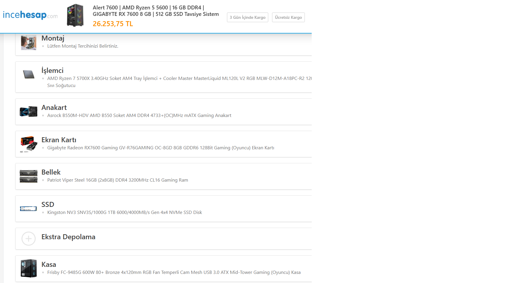 AMD 7500F-GIGABYTE Radeon RX 7600 GAMING OC 8GB-A620 -KINGSTON 16GB DDR5-512GB SSD Uygun Fiyatları ile Tebilonda