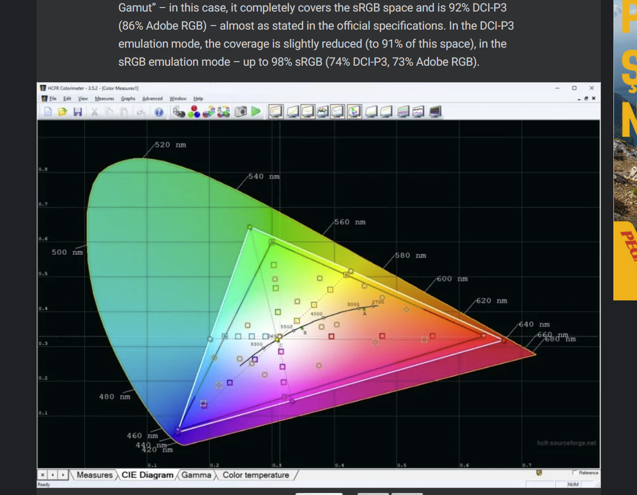 Asus da MSI da renk kapsamlarını CIE1976 alanında vermiş. Karşılaştırma için çoğunluğun kullandığı CIE1931 kullanıyoruz. 76 sayısal olarak biraz daha yüksek çıkar. Attığım Lenovo CIR1931 alanından. CIE1931'e göre birden fazla profesyonel incelemeci tarafından Asus da MSI da %90-91 ölçülmüş: