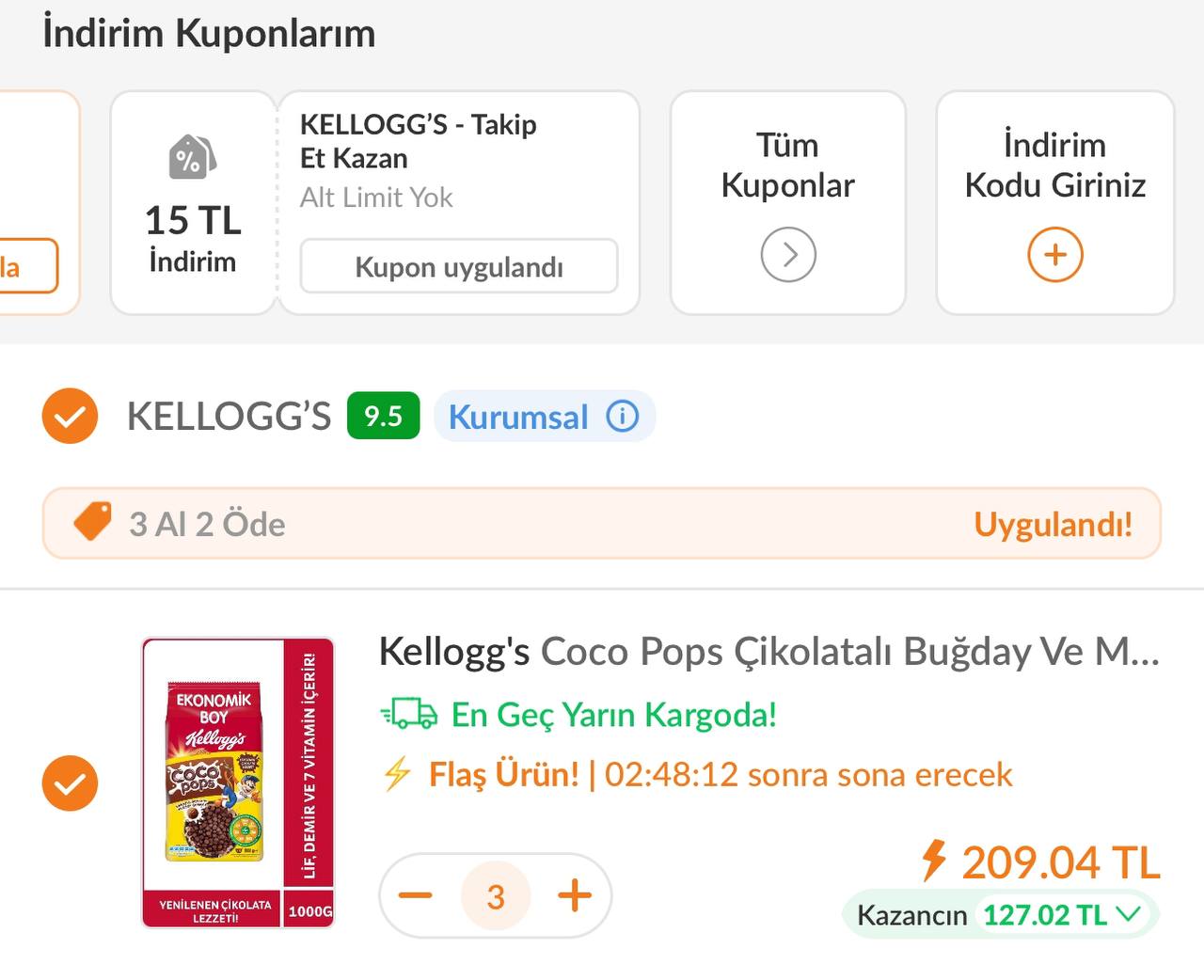 Kellogg’s Coco Pops Çikolatalı Buğday ve Mısır Gevreği 1kg 3 Al 2 Öde + 15₺ takip kuponuyla 3 adeti 209₺