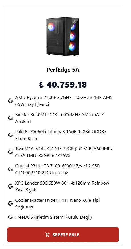 Selamlar. 4 veya 5 güne bir kasa alcağaım. Bütçem 40k civarında. Öncelikle bu bütcede 9060XT 5060 Ti gerisinde 7800XT de teknoloji olarak çok geride FSR3 o yüzden AMD ekran kartlarına pek sıcak bakmıyorum. NVIDIA Reflex falan da var o yüzden bu bütçede küçük bir araştırma sonucu bu hazır sistemi buldum.