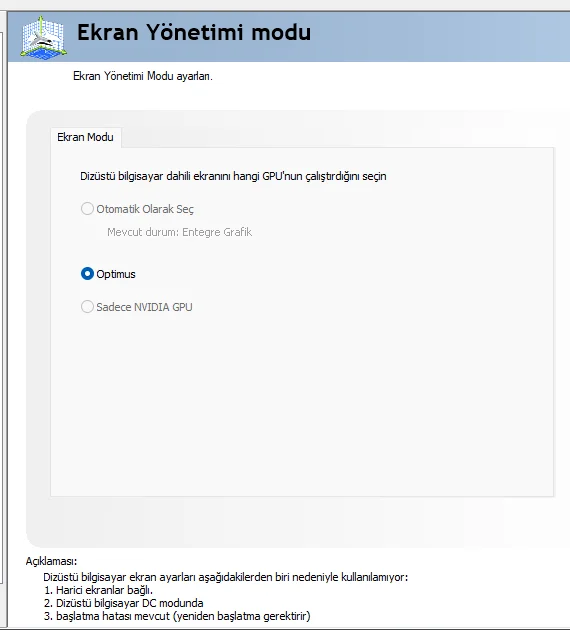 Arkadaşlar merhaba laptopu 2. ekranla birlikte kullanıyorum lenovonun monitörü var sistem yük altında otomatik 4060 geçiyor ama normal zamanda işlemcinin ekran kartıyla çalışıyor i7 13650hx işlemcim var ama photoshop gibi uygulamalarda sistem kasıyor bende manuel olarak 4060 ekran kartına geçirmek istiyorum ama geçmiyor nasıl çözerim