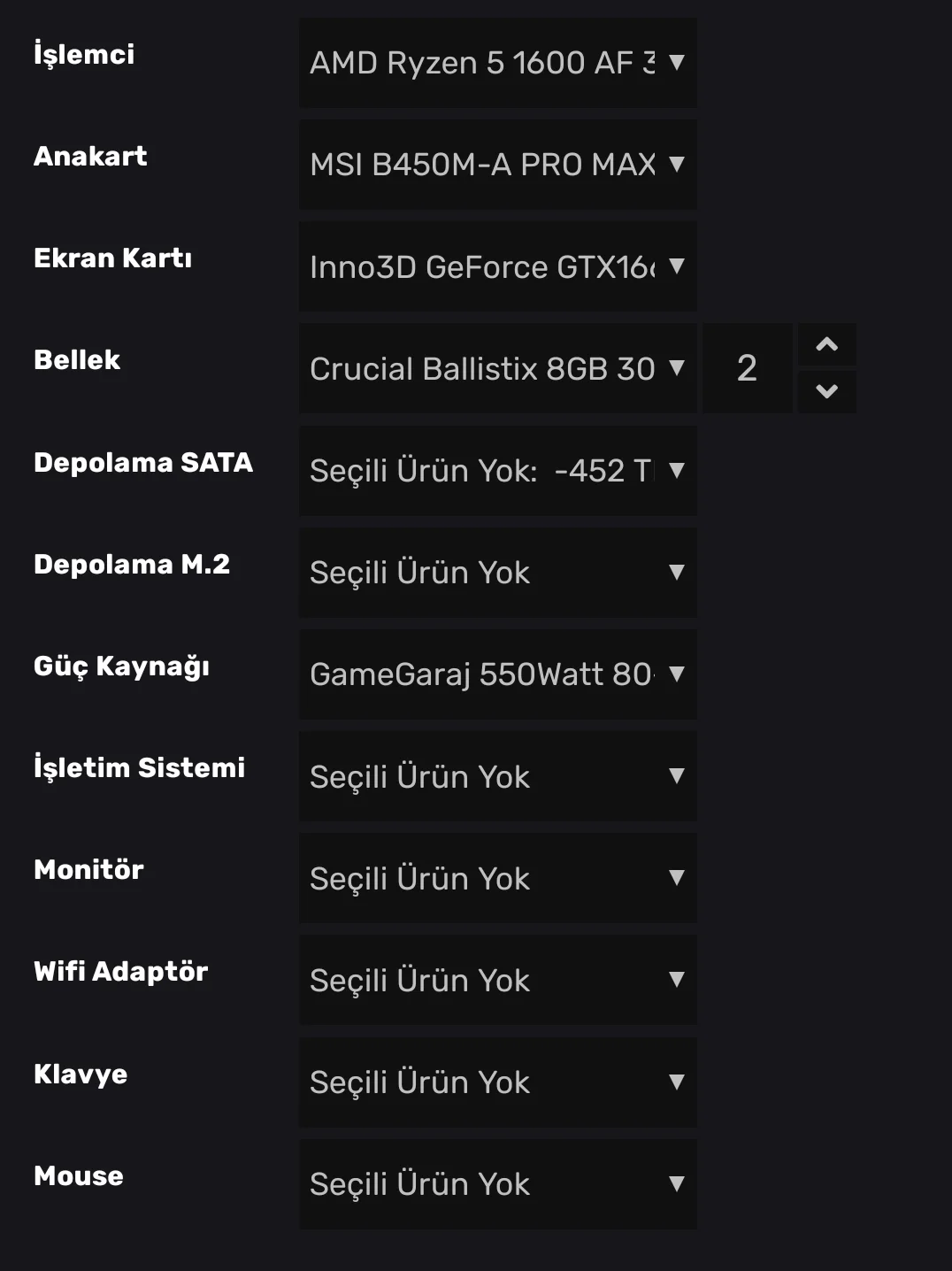 1600AF, 1660Super, 2 adet RAM seçip sata SSD çıkartıp P1 m2 SSD eklemenizi öneririm.