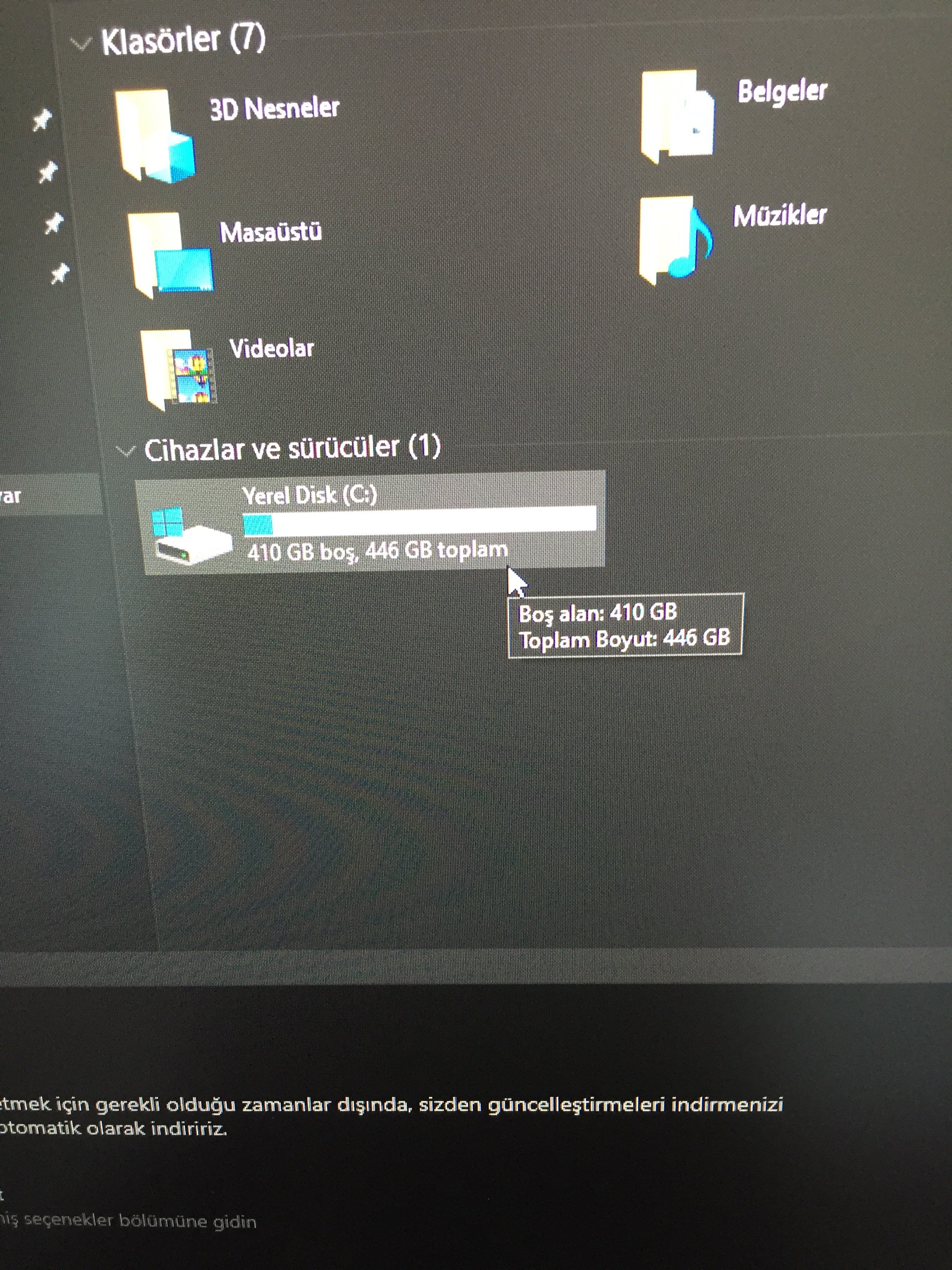 Sol altta windows logosuna sağ tıklayın oradan "disk yönetime" girin. Orada siyah şeritli bir kısım var mı?bilgisyarcıya format için pcmi verdim parça vb çalmamış ama fotodaki gibi durum var ve c klasörü dışında klasör yok