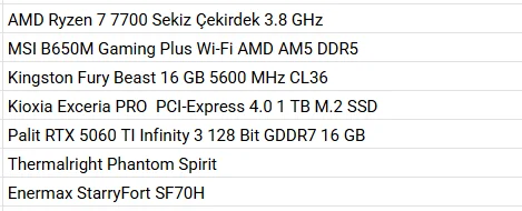 ekran kartı harici kalan parçalar için bütçem 25k