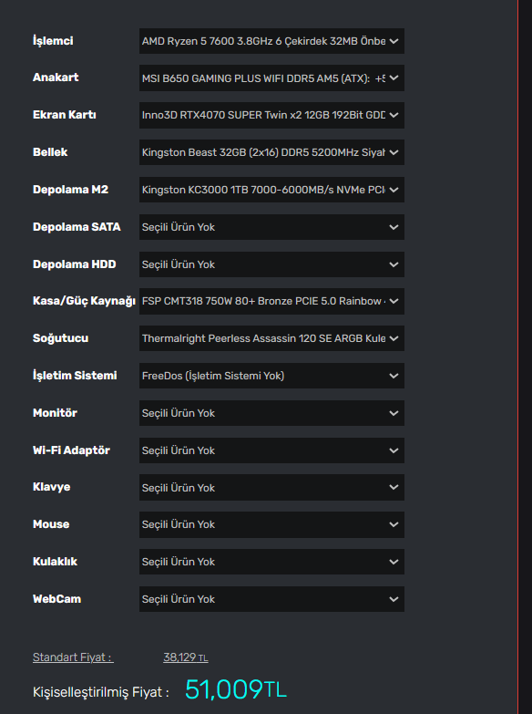 Sınerji Techolay V1 özelleştirince 54k oluyor tek kafama yatmayan Palit RTX 4070 Super Dual 12 gb. Shark'ı özelleştirince ise 51k oluyor.