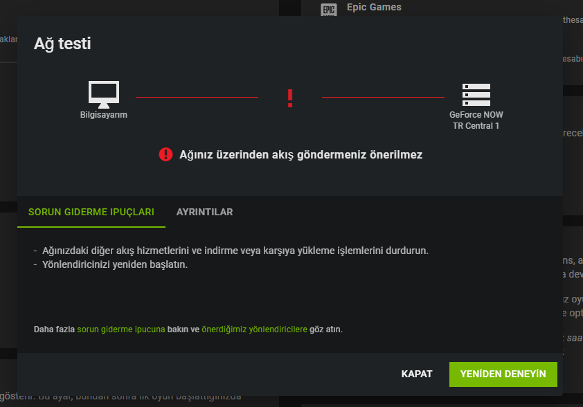 Ben 3 ay once geforce now kullanmayı bıraktım cunku kullancı sayısı cok fazla arttı ve 1 - 1,5 saat sıra beklemeye başladım. Dün tekrardan giriyim dedim ve ağınız üzerinizden akış göndremezsiniz hatası aldım Alıntıyı görüntülehata işte buydu fakat aldıgım hiz ise bu yardımcı olur musuunzAlıntıyı görüntüle
