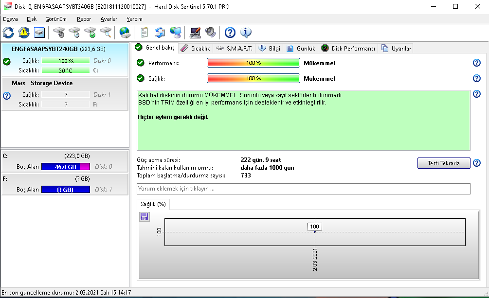 Garantisi duruyorsa vakit kaybetmeden garantiye göndermeni öneririm. Sıfırını yollarlar SSD'nin.İlginç bir şekilde %100 çıktı.Testi 2 kere tekrarla dedim.SSD yi de yaklaşık 7 8 aydır kullanıyorum sanırım.