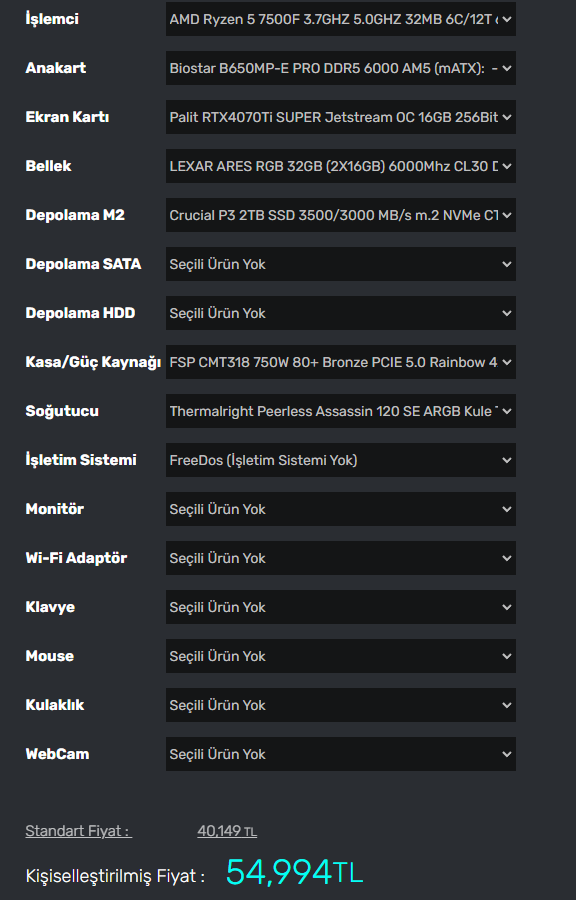 1080p'de kullanacağın için darboğaz yememek için kesinlikle 7800X3D + 4070 Super daha iyi olur. Soğutucu olarak Thermalright Peerless Assassin kısmen yeterli olur ama Thermalright Aqua Elite 360mm veya en kötü bi Thermalright Aqua Elite 240mm seçebilirseniz süper olur. SSD'yi 1 tb'a düşürürseniz bütçeniz yeter. Şu şekilde alabilirseniz süper olur, bunun üstüne crucial p3 2tb seçebilirseniz de maksimum o olur.