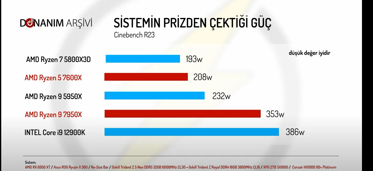 300watt çeken işlemci hangisi? Attığın hangi videoda nerede 300w+ 1 saat cinebench testi var? Ben ortada threadripper 7995 göremedim? Yoksa sen 7950nin 300w+ çektiğine mi inanıyorsun cinsbenchte?