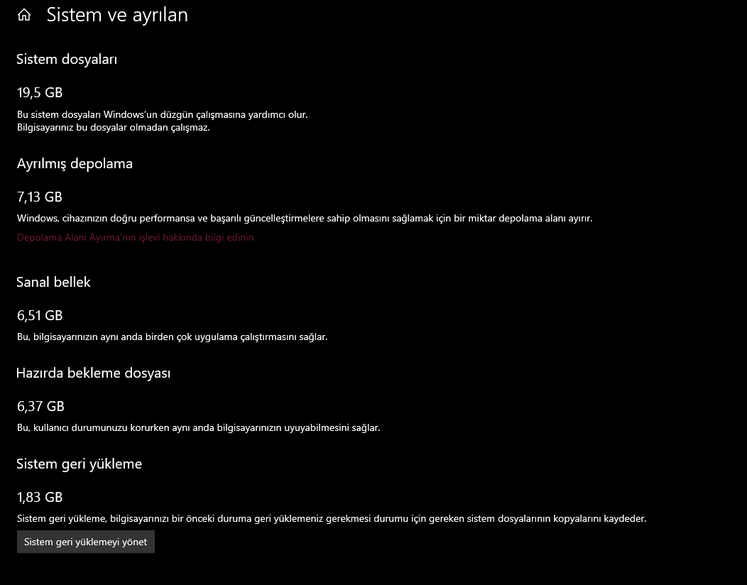 Depolama ayarlarında görseldeki gibi sistem 70gb çıkıyor bu niye bu kadar fazla