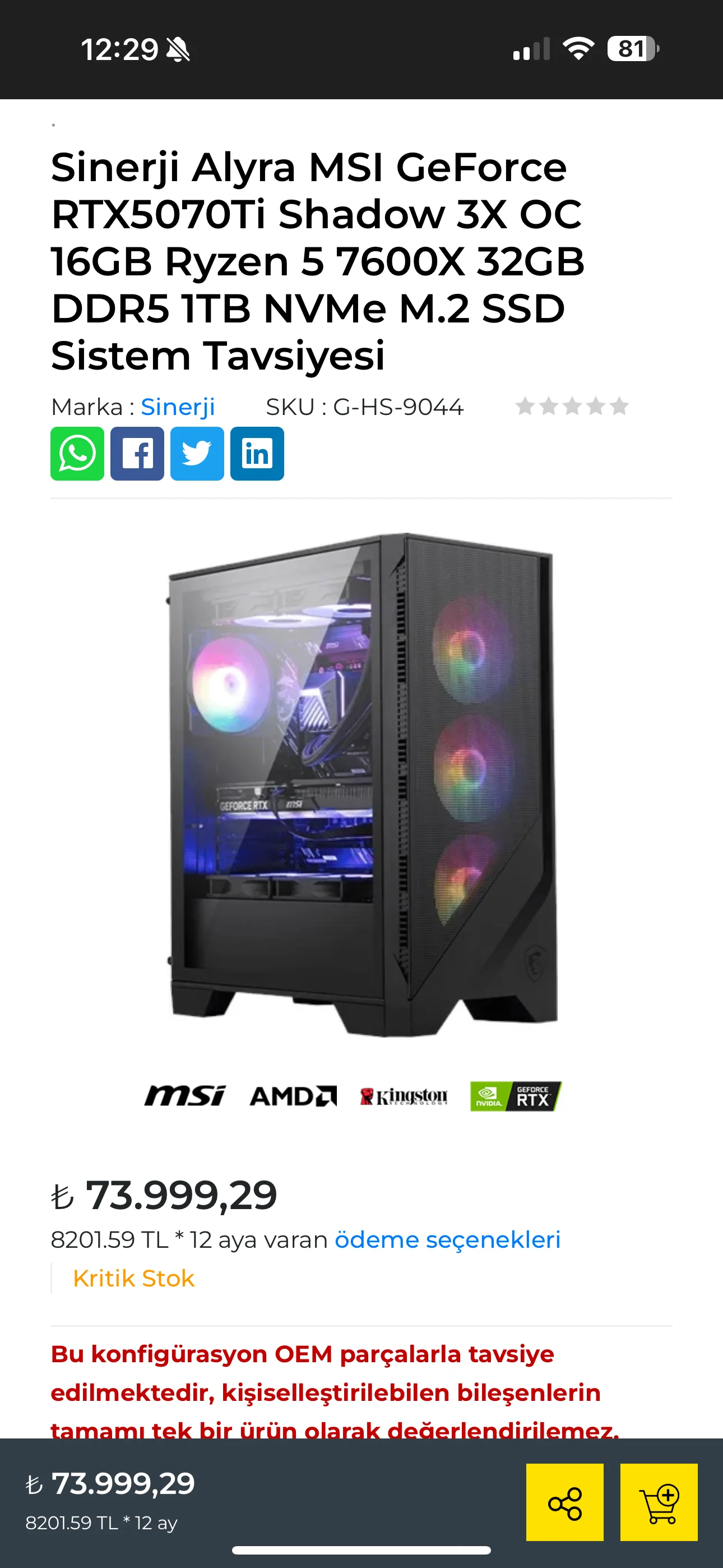 Aşağıdaki sistem alınır mı sizce74.000₺ fiyat Sinerji Alyra MSI GeForce RTX5070Ti Shadow 3X OC 16GB Ryzen 5 7600X 32GB DDR5 1TB NVMe M.2 SSD İşlemci ModeliAMD Ryzen 5AnakartMSI B650 Anakart iEkran KartıMSI Nvidia GeForce RTX 5070Ti Ekran Kartı iRAM32GBSSDKingston 1TB NV3 NVMe SSDEkran Kartı SerisiGeForce RTX 5070Ti Ekran KartıİşlemciAMD Ryzen 5 7600X İşlemciEkran KartıGeForce RTX PCPowered byMSI Tavsiye Sistem