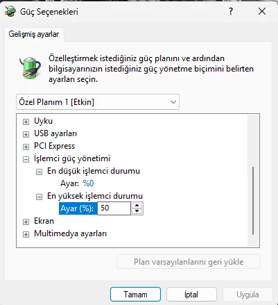 SelamünAleyküm arkadaşlar oyun olarak Silkroad Online oynuyorum ve genelde 12 char açık ve bilgisayar 7/24 açık geçen hafta işlemcinin 90 dereceleri gördüğünü fark edip termal macunu yenilettim ve sorun devam etmeyi sürdürdü ve biraz araştırma yaparak sonunun ne olduğu ile ilgili görev yöneticisinden performans ayarlarına gelince işlemcinin sürekli %100 çalıştığını fark ettim formda bir konuya denk gelip güç planı ayarlarından güç seçeneklerine girip orada işlemci çalışma aralığı olduğunu fark ettim ve maksimum %50 ile çalışsın yaptım işlemci sıcaklığı 50-55 derece arası gezinmeye başladı ama işlemcide ortalama takip ettiğim kadarıyla %20 %40 arasında gidip geliyordu bu işin başka bir çözümü var mıdır yardımcı olabilecek arkadaşlar varsa sevinirim 2 resim yüklüyorum bununla alakalı şimdiden teşekkür ederim iyi forumlar.
