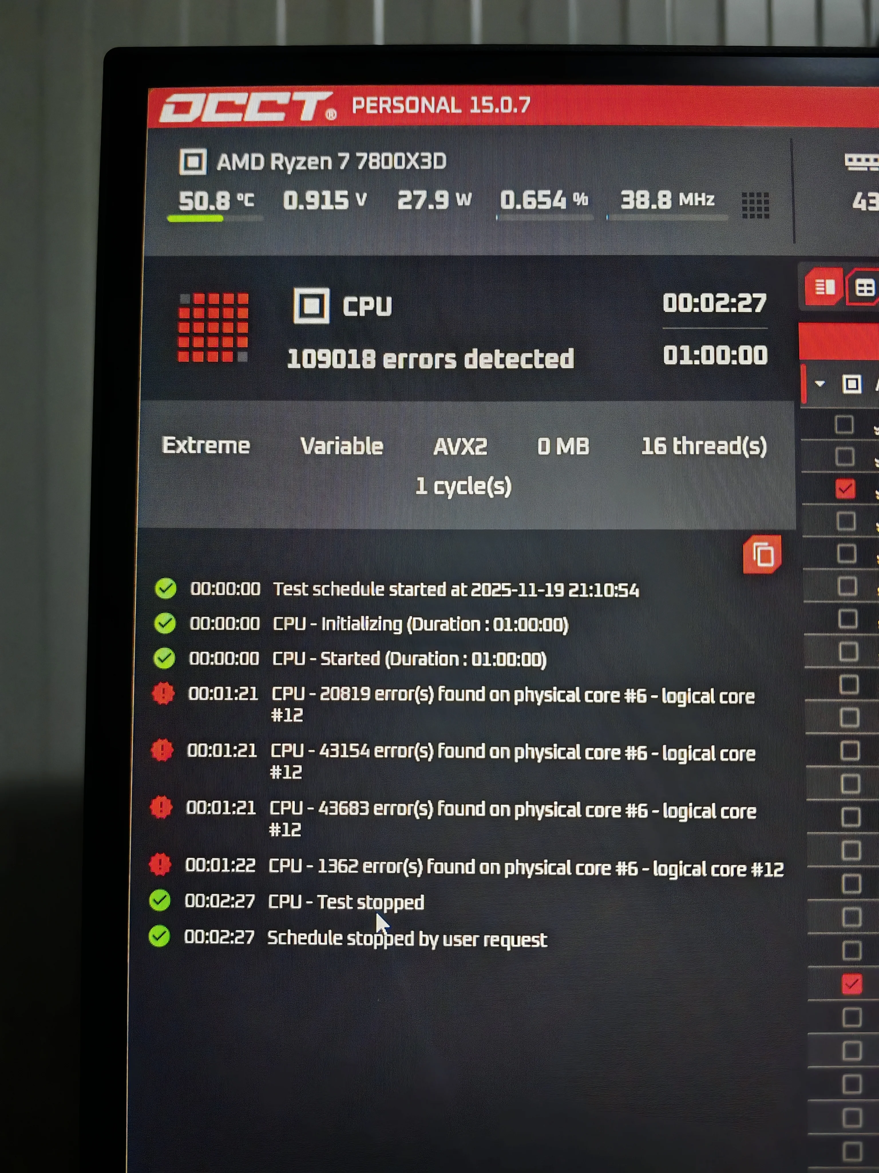 B650M-R Anakart ve cooler master ML240 V2 sıvı soğutma kullanıyorum işlemci çok rahat 85 dereceleri görüyor curve optimizer yaptım negatif değer 30 da fotoğraftaki hatayı aldım 25 denedin Occt de yine hata verdi negatif 20 değeri girince hata almadım ancak sıcaklıklarda değişme olmadı bu benim işlemcimin silikon kalitesinin kötü olduğunu mu gösterir?