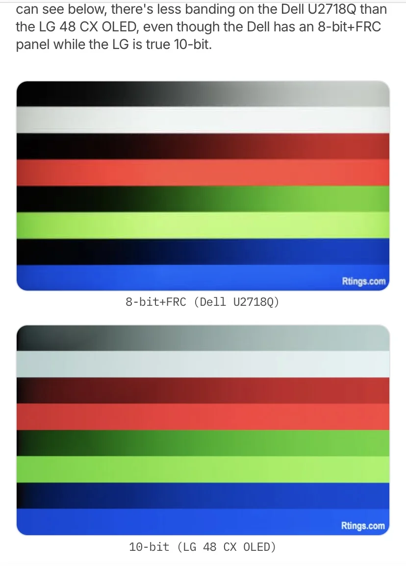LG oled gerçek 10 bit ama gradyan işleme performansı zayıf. Dell ise 8 bit + frc ile 10 bit ve iyi gradyan performansı sayesinde daha iyi.