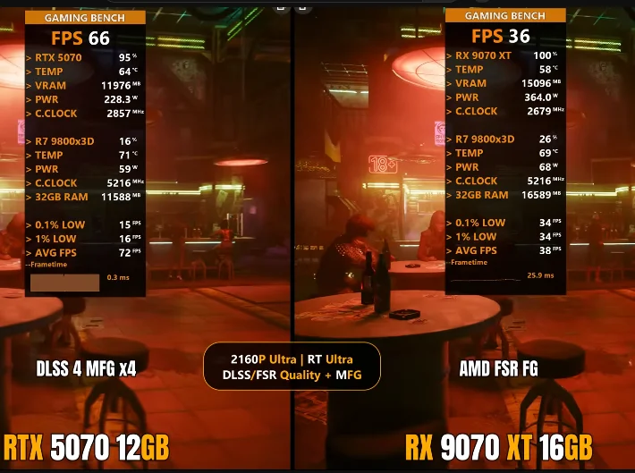 Amd kas gücüne önem vermişken nvidia teknolojiye önem vermiş. Amd'ciler kas gücünü överken diğer tarafta teknolojileri övüyor. Bundan rahatsız olmamanız lazım.Dostum birinde 2x fg açık diğerinde 4x. Kimse fg kapalı test yapın demiyor. İkisinde de 2x açılmalı.