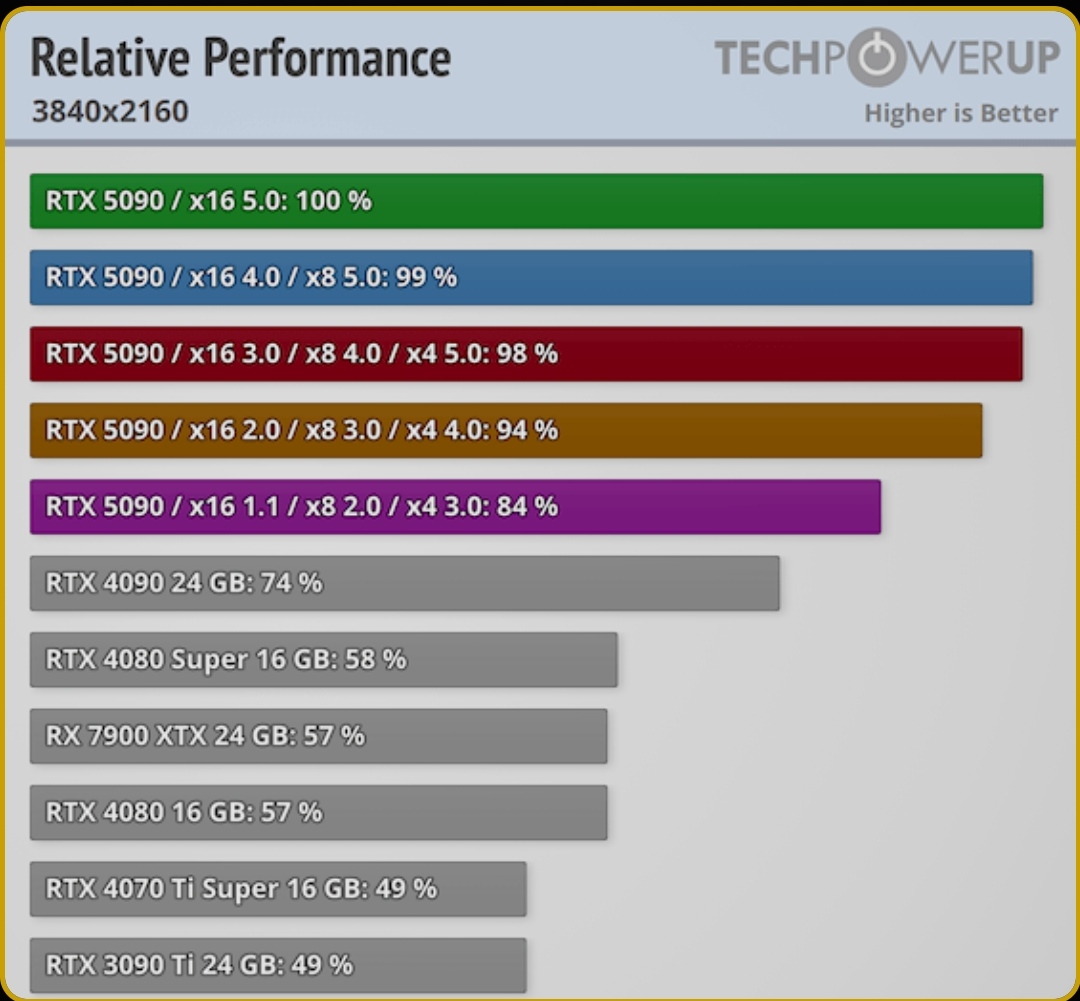 PCI express 3*16 da bile 5090 için bile %98 verim aliyorsun. PCI-E 2*16 da bile sadece %6 kayıp var.