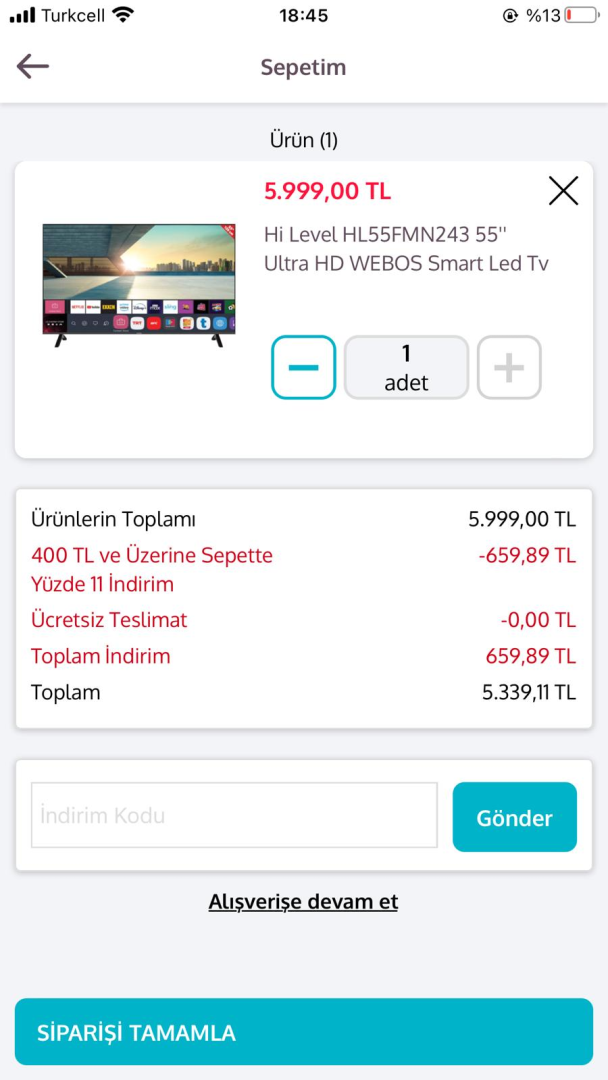 400 TL üzeri %11 sepet indirimi varmış.