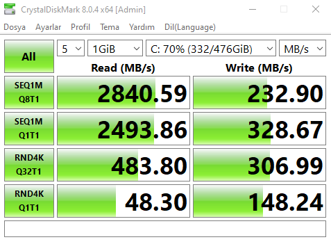 Yazma hızı değişken: 100mbs ile 2200 mbs arasında gidip geliyor. Çoğunlukla 600 700mbs lerde kalıyor. (100mbs düştüğünde zaten pc donmaya başlıyor)