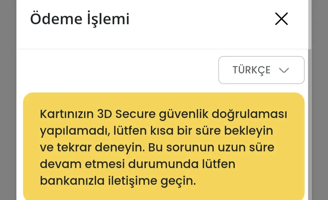 K Katrisa 80+ Katılım 7 Ağustos 2025 Mesajlar 1 Reaksiyon skoru 0 23 Aralık 2025 #1 Ekte görüldüğü gibi internet üzerinden alışveriş yaparken chip para kullanmak istedim böyle bir hatayla karşılaşıyorum daha önce karşılaşan sorunun sebebini bilen var mıdır banka düzgün yardımcı olamadı Ekler IMG_20251223_133254.webp 39.6 KB · Hit: 24