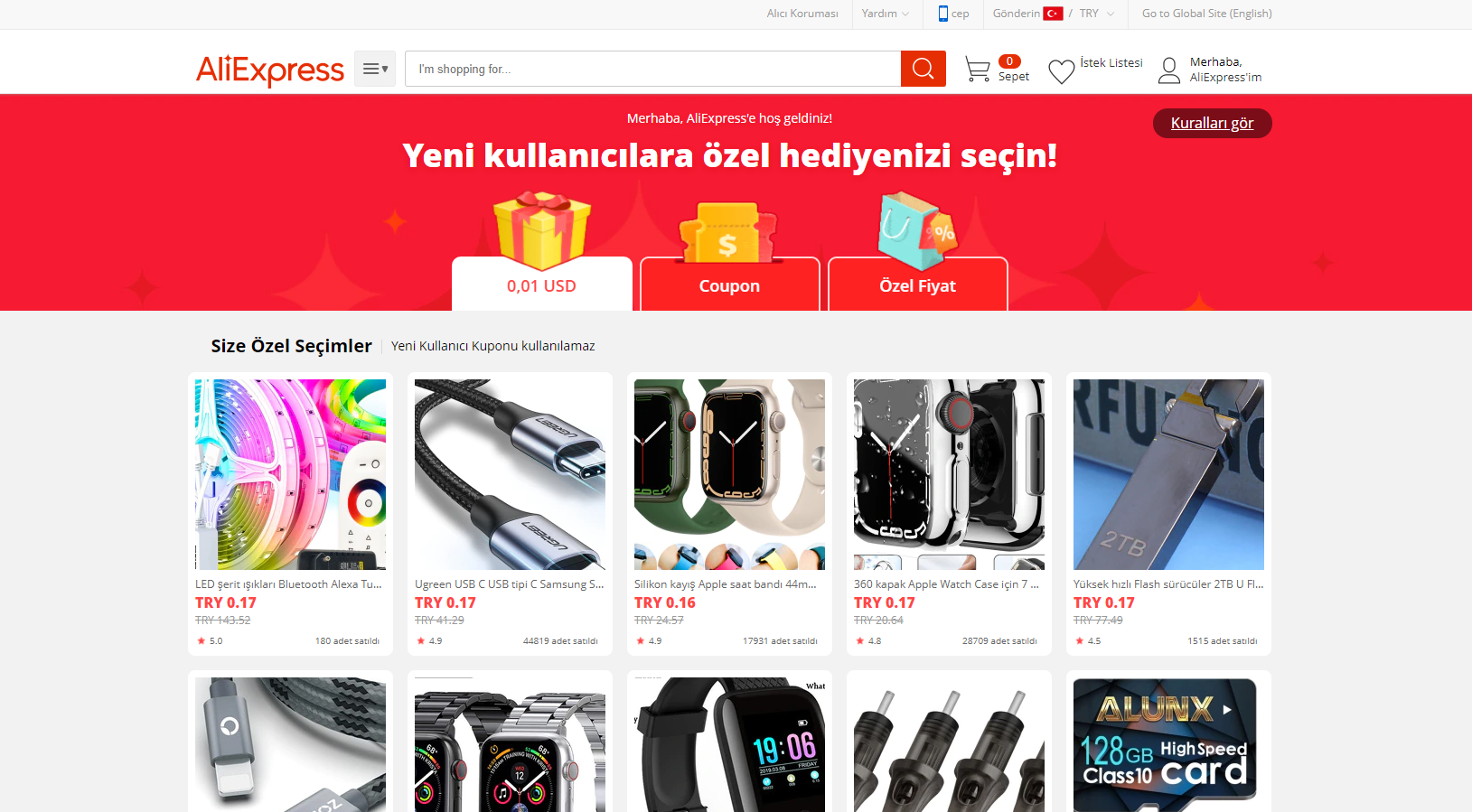 yeni hesap açanlara 0.16 kuruşa satıyor bazı ürünleri
