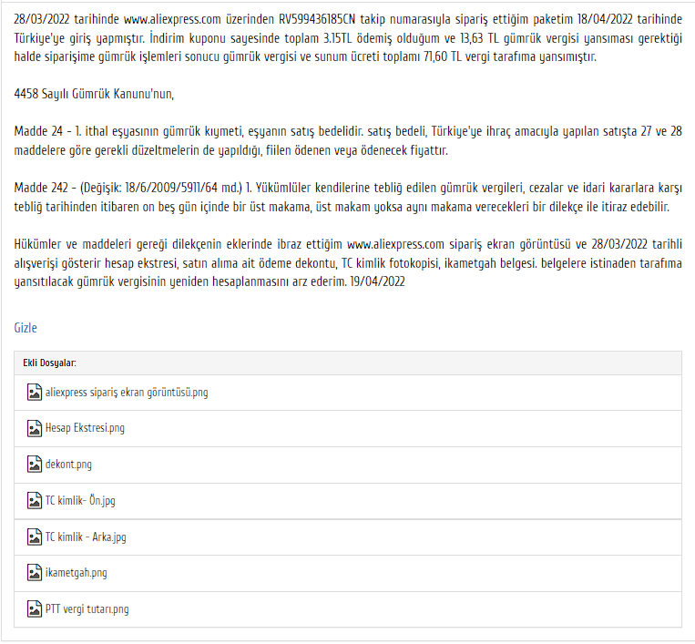 Cevap aldın mı CIMER'den? Benim 20 gün oldu hala dönüş yok.Edit: Kargo gümrükten çıktı, 71.60TL vergi çıkmış kargoyu alıp almama konusunda kararsızım 3tlye aldığım ürüne 72TL vermek zoruma gider açıkçası. İtiraz hakkım var galiba ancak epey uğraştıracak gibi bilemedim.
