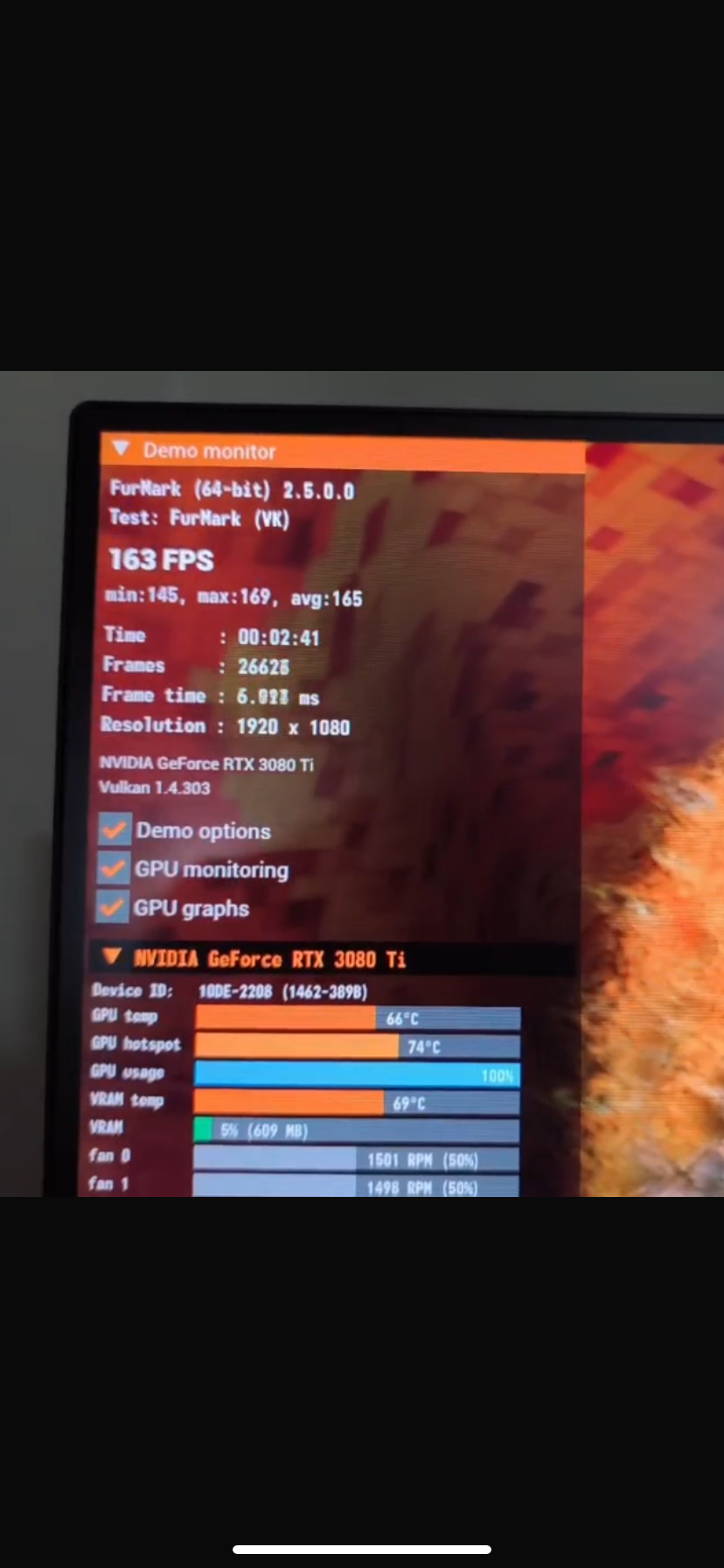 Bana bu değerler düşük gibi geldi furmarkın diğer sürümlerinde bazı arkadaşlar testlerinde 260-290fps arası görüyor 1080p’de. acaba sabit olarak %50 fanda çalıştığı için mi fps değerleri düşük? şu ayarı değişip tekrar deneyin dediğiniz bi ayar var mı?
