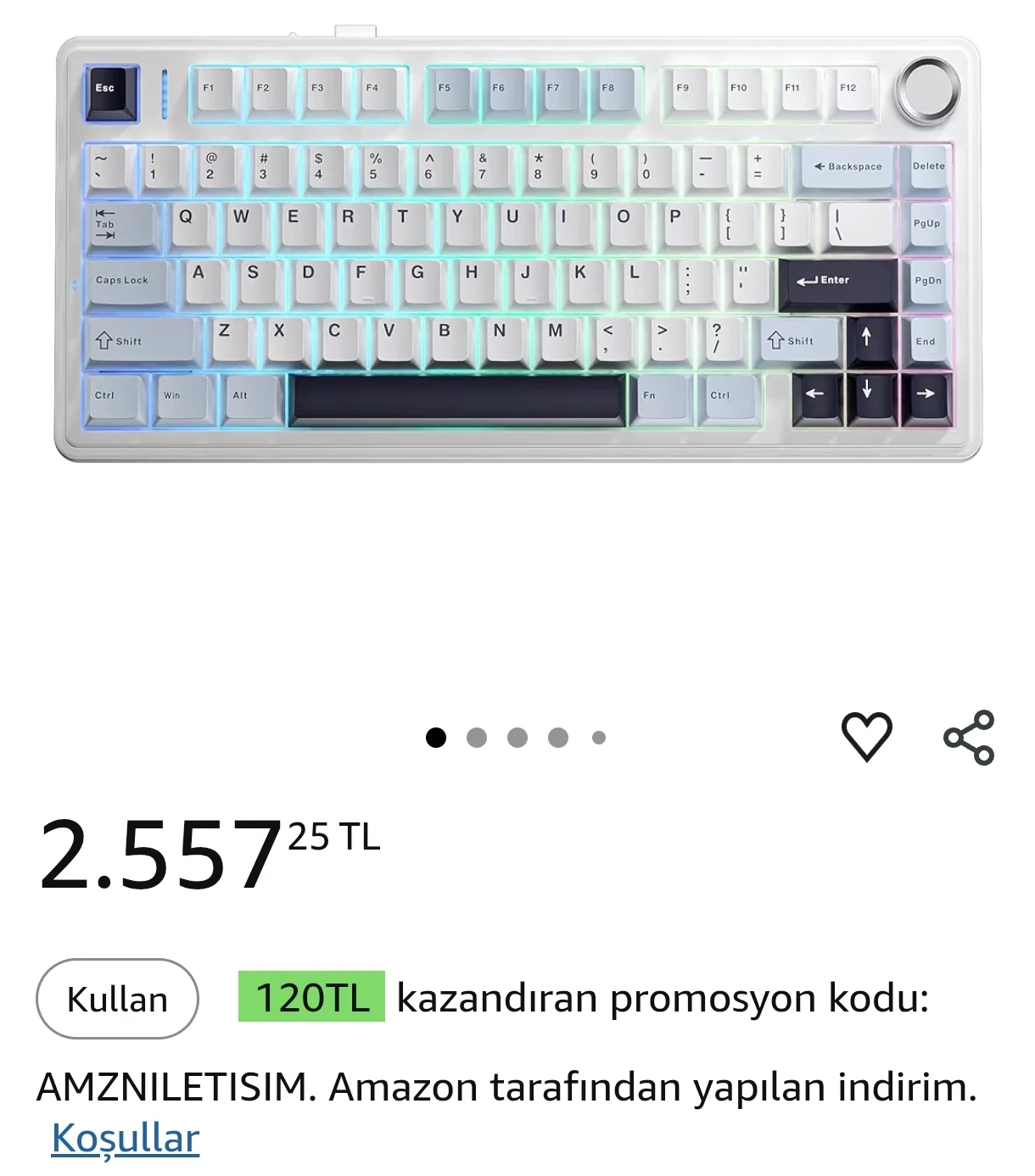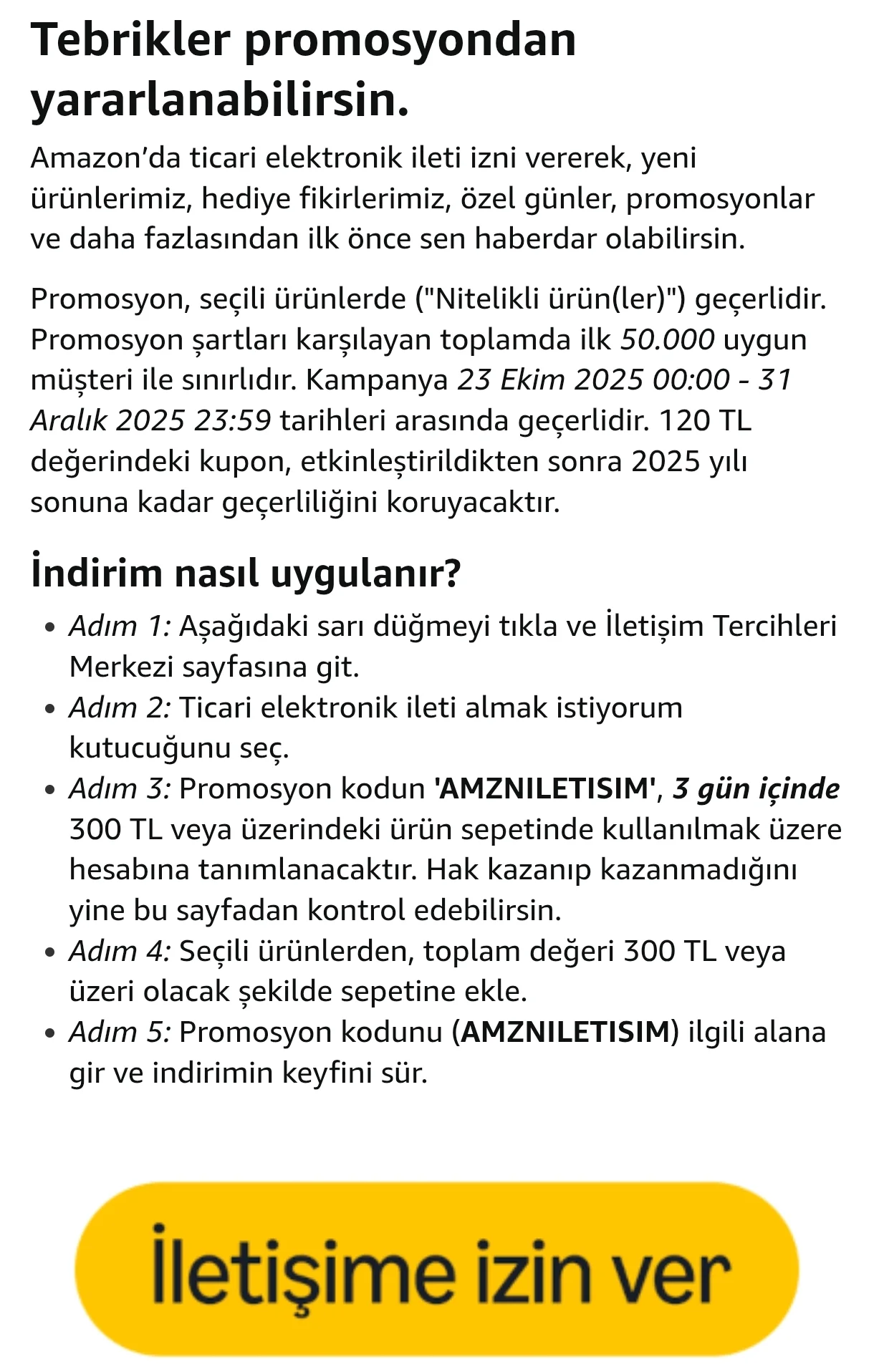 merhabalar amazonda geçen günler şöyle bir kampanya gördüm ve katıldım dün bildirimi geldi kod tanımlanmış tüm ürünlerde geçiyor kullanmayan ve haberi olmayan varsa baksın bi 120 tl 120 tldir.