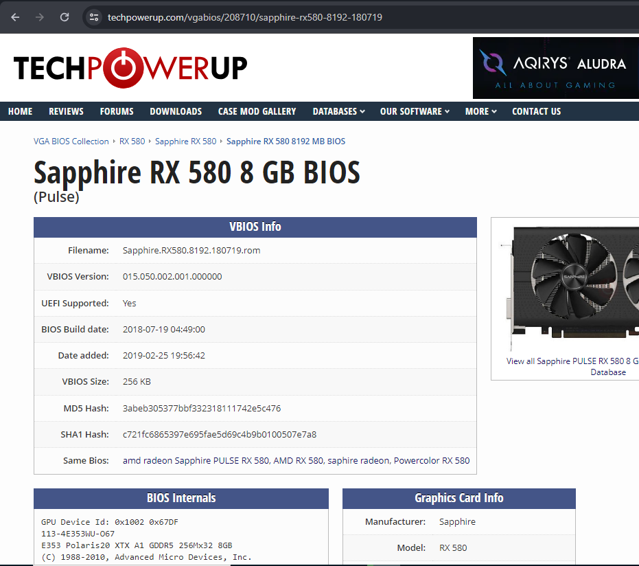 vbios'un bu sürümü zaten yüklü diyorSenin kartta yokmuş sanırım o. Bu BIOS'u da dene bakalım. https://www.techpowerup.com/vgabios/208710/sapphire-rx580-8192-180719