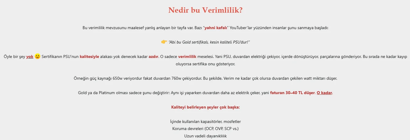 Burada aşırı derecede hata var. Verimliliğin DC çıkış hattıyla alakası yok; bu prizden çekilen watt ile ilgili. Sırf 80+ sertifikasına bakarak bir PSU’nun kaliteli olup olmadığını anlayamazsın. Ayrıca A750GL nasıl 450W verebilir? PSU zaten tek kanallı ve tek kanal üzerinden 744W sağlıyor. En azından Corsair CV veya VS gibi grup regulasyonlu 12v hattında kayıp olan örnekler verseydiniz. Gidipte verilebilecek en saçma örneği vermişsiniz. Ki tüm bunları geçtim bir PSU tek kanaldan 450w veriyorsa, bunun üzerinide verebilir OPP tetiklenene kadar. Verirken kanallar aşırı derecede düşmezse stabil çalışmaya devam eder. Bu PSU'nun tasarımı ve regulasyon çeşidiyle alakalı. 80+sertifikasıyla değil.Sistemde Psu Önem