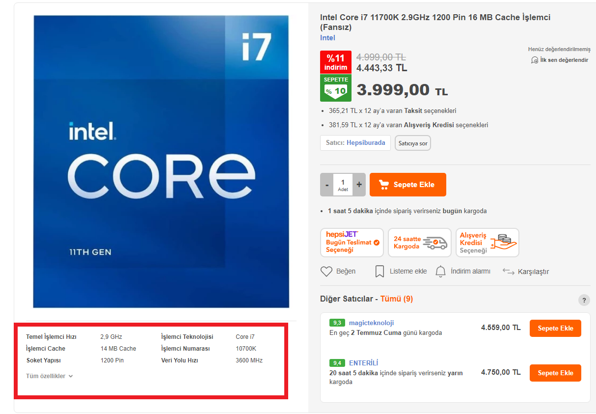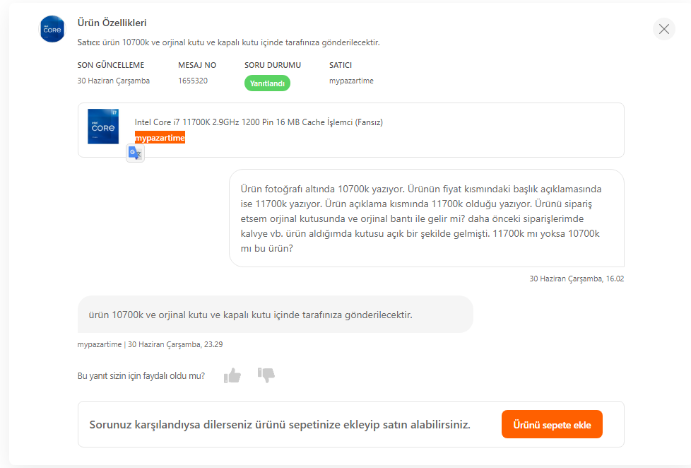 hepsiburadanın i7 11700k diye başlık atılmış işlemcisinde, ürün resminde 11. nesil intel fotoğrafı gözüküyor. Fakat resmin altında 10700k yazıyordu. Aynı zamanda ürün açıklamasında da 11700k özelliklerini vermişlerdi. Açıklama kısmının altında da 10700k özelliklerinin olduğu bir açıklama kısmı daha vardı. Bu ürüne destek talebinde bulunup ürünü sormak istediğimde ise beni mypazartime diye bir satıcıya yönlendiriyordu. Ürünü sordum ve 10700k göndereceklerini yazdı bana.