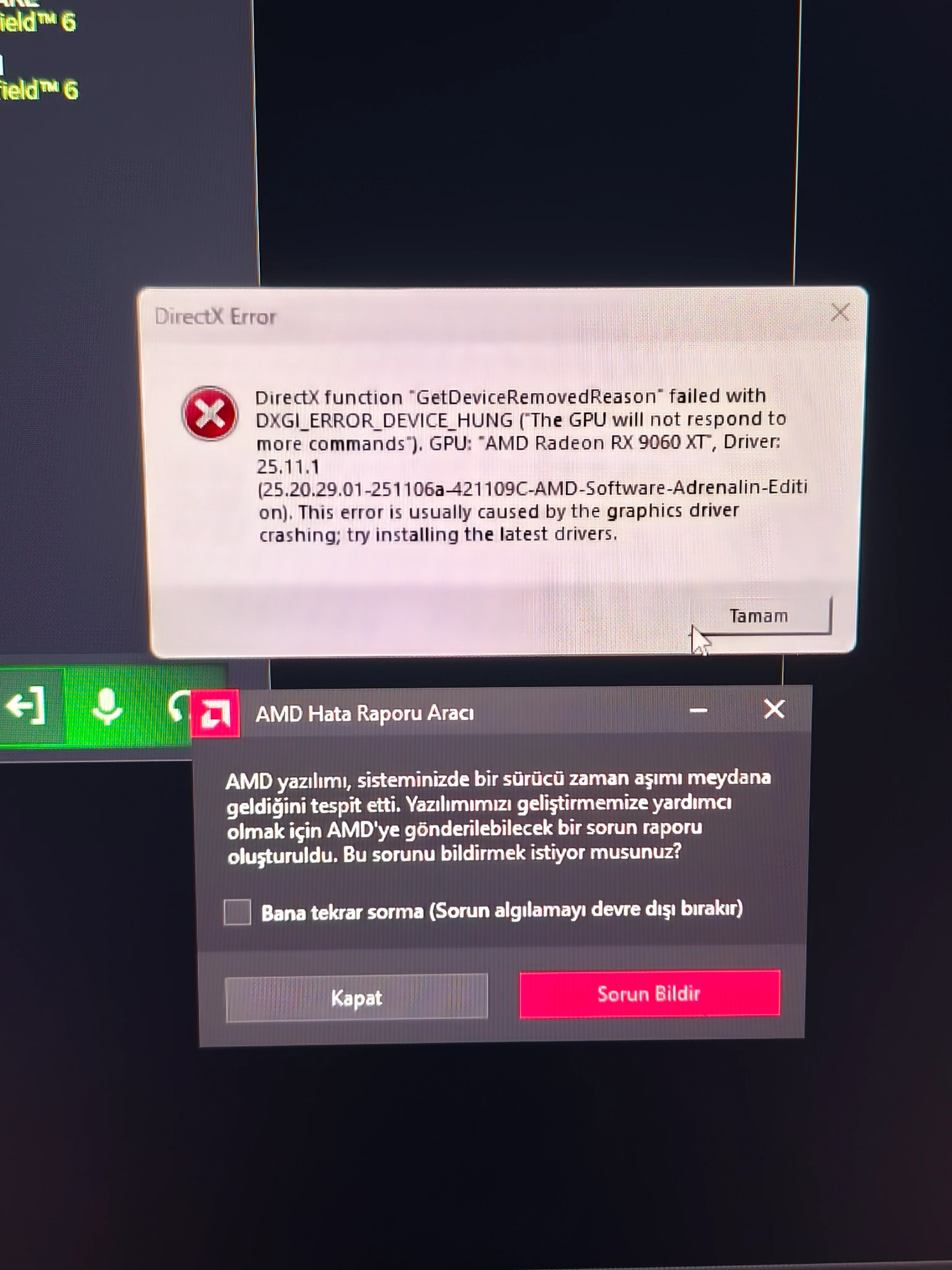 AMD rx9060 XT Ekran kartı BF6 da grafik sürücüsü hatası veriyor