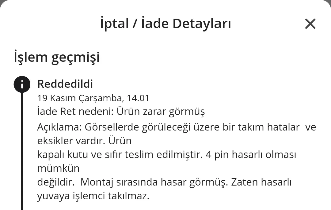 MSI A620M-B anakart almıştım 4 pini yamuktu fakat işlemciyi taktığımda çalışıyordu neyse dedim 1 hafta kadar öyle kullandım, Kasım indiriminde MSI B650M-B modeli A620M-B anakartı aldığım fiyattan daha ucuza düşmüştü. Bende iade edip b650m-b alıyım zaten ürün sorunlu diye düşünüp iadeye verip almıştım b650m-b anakartı. Talebinize en geç 14 kasımda yanıt verilecek yazan anakartıma yanıt az önce geldi ve red çıkmış. Sebepleride bozuk pinli anakarta işlemci takılmazmış