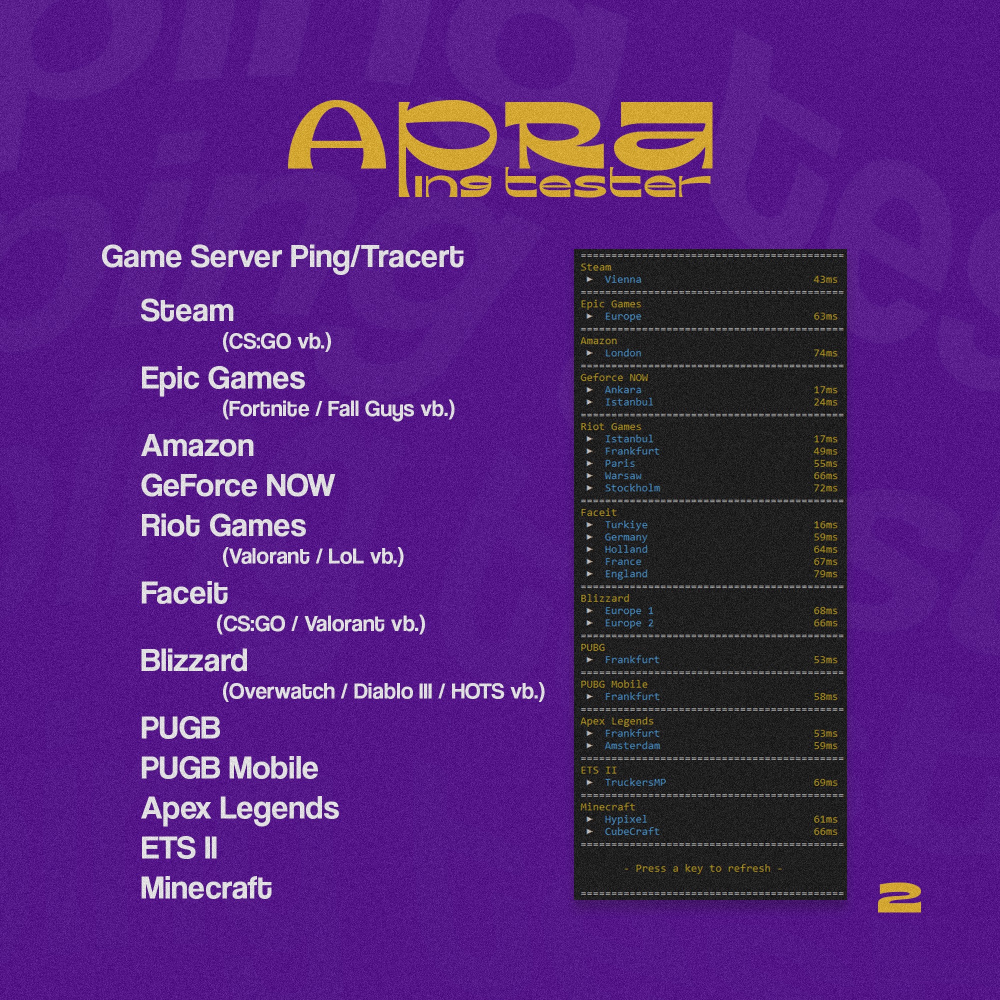 - Programa eklenmiş (Oyun, DNS, gibi) sunuculara ping atarak bu değerleri size gösterir ve o sunucularda kaç ping aldığınızı görebilirsiniz.