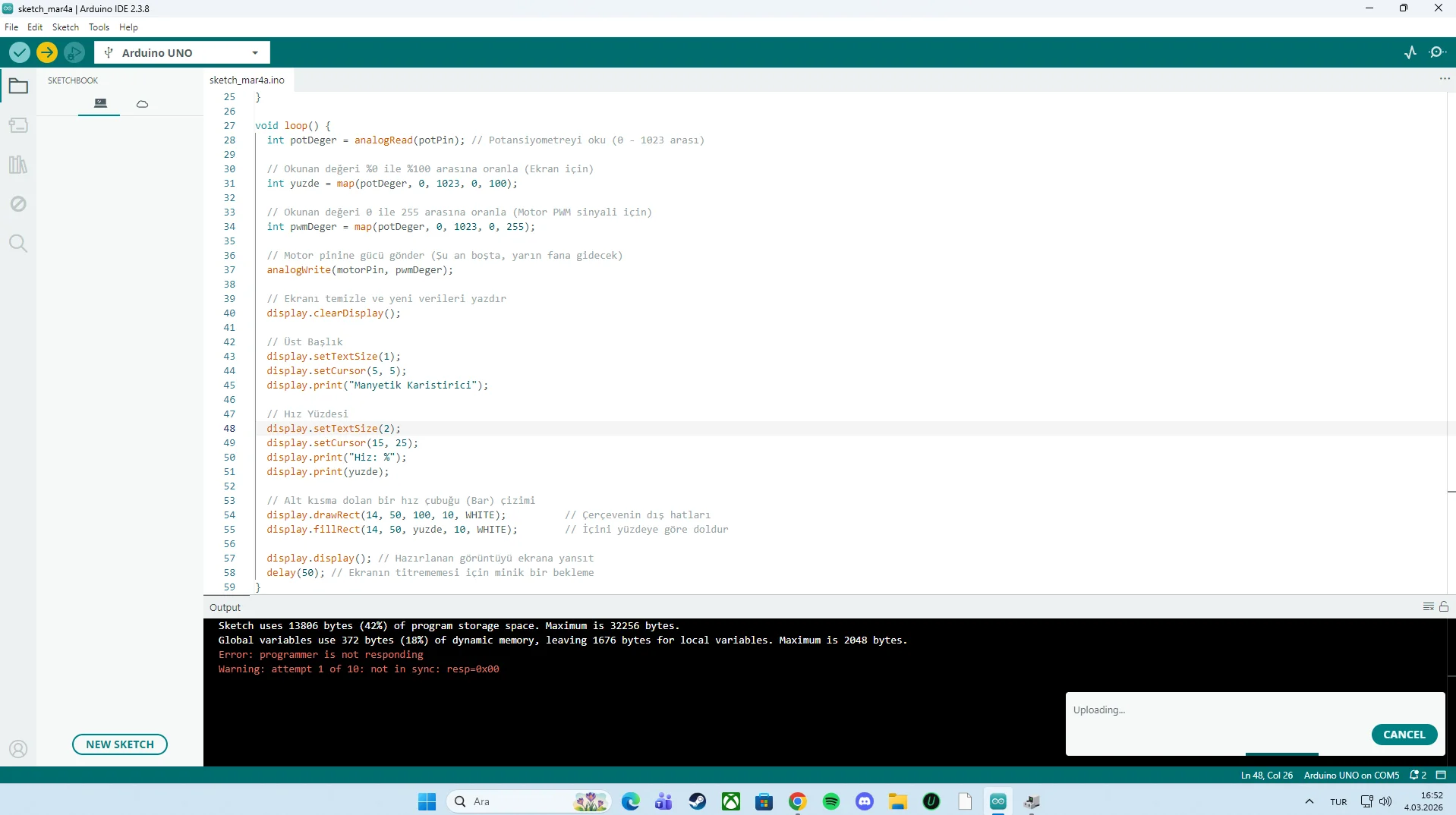 Arduinoyu yeni bugün aldım. Bağladığım gibi bu sorun çıktı. Port değiştirmeyi denedim. Sürücü de yükledim yine aynı durum. ACİL proje için yardım lazım yardımcı olun lütfen.