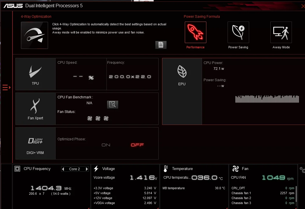 Selamlar herkese. Asus Ai suite 3 programını kullanıyorum. Birkaç haftadır bilgisayarım fazlasıyla soğuk oluyordu ve programda baktığımda 220w güç çeken fx 9370 işlemcimin güç tüketimi 6wdı ve de 4400mhz olması gereken değer 1400mhz olmuştu normalde boşta 40 derece civarında seyreden işlemcim 26 derecelerde ve yük altında 40ı görmüyor. Biostan baktığımda hiçbir sıkıntı yokken bu program açıkken sonuçlar bu şekilde oluyor. Programı nasıl sıfırlayabilirim bilmiyorum yardımcı olur musunuz ?