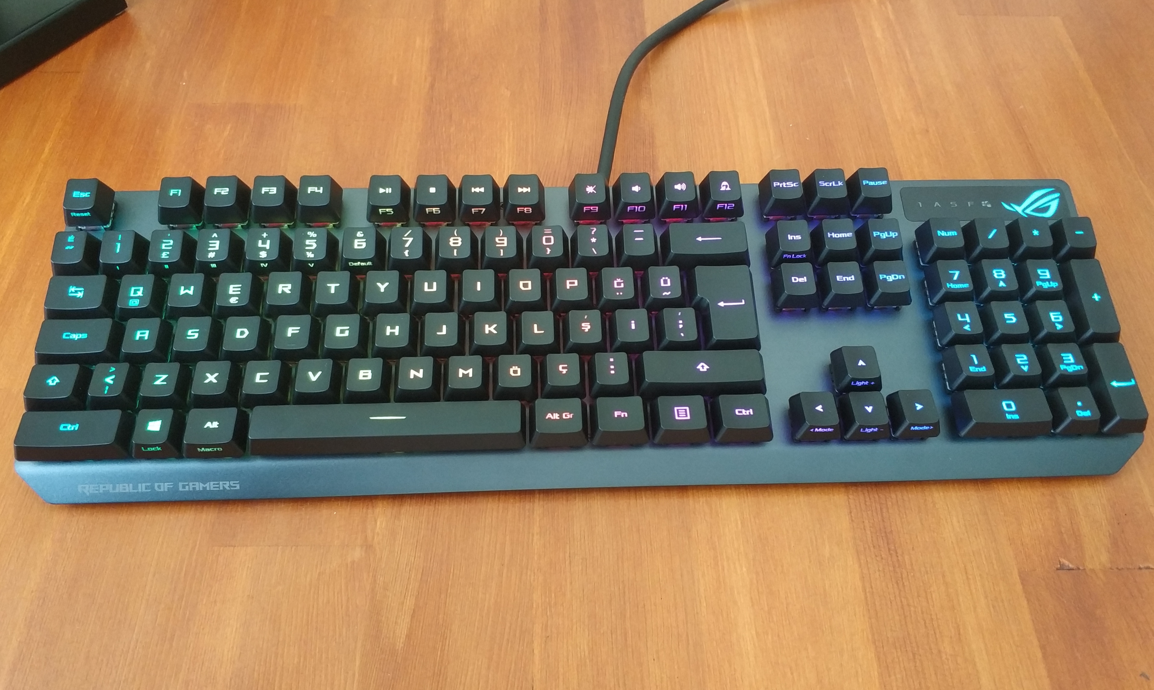 Klavyede Aura Sync destekli rgb tuşlar bulunuyor. Rgblerin ışık düzeyi klavye uzerinden %25,%50,%75,%100 olacak şekilde ayarlanabiliyor. Iki kat genişletilmiş ctrl tuşu, gizlilik tuşu ve windows tuşunun işlevini kapatmaya yarayan Windows Lock özelliği var. Klavye üstünde 1 tane Usb 2.0 portu var. Suya ve toza dayanıklı IP56 sertifikasına sahip. Klavyenin kablosu örgü değil fakat kalın bir plastik kablo ile geliyor. Klavyenin kasası alüminyum ve sağlam olduğunu hissettiriyor. Klavyenin alt tarafı tırtıklı ve büyük bir Rog logosu göze çarpıyor.5 farklı yerinde kaymaz kauçuk bulunuyor.