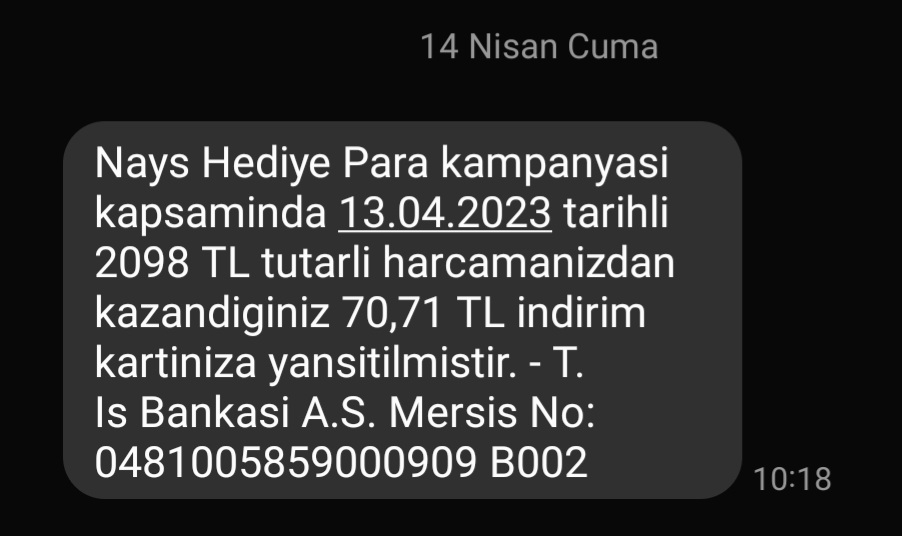Evet indirimli diye bu naysı kullanayım dedim. Ee şimdi bu aylık hakkım bitti mi? Daha kullanmayayım mı naysı? Kendi kartım vade farksız 6-9 taksitlerle bölüyor. Ben sırf ucuza gelsin diye naysla ödemiştimhocam bu ay içinde başka alışveriş yaptıysanız kart ile ondan dolayı kalan kısmı kadar cashback vermiş. 1800 liralık bir alışverişiniz var sanırım.